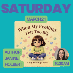 Feelings can be overwhelming, and Janine Holbert, local writer and kindergarten teacher is here to help.  Janine will be reading her book and sharing her experiences as a teacher.  The event is free and perfect for preschoolers and kindergarteners. And there will be treats for the littles.